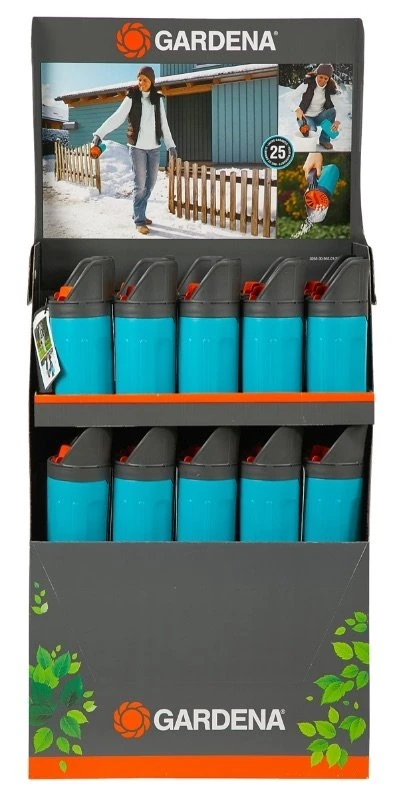 Strooigoed zoals zand, zout,grit en kunstmest kan nu gelijkmatig over kleinere oppervlakken gestrooid worden met de GARDENA strooier – zonder vuile handen! Het unieke doseersysteem maakt dit mogelijk. Draai de doseerschijf op het deksel en kies de gewenste doseeropening (afhankelijk van het strooigoed) van grof naar fijn. De grote, gemakkelijk te bedienen instelknop kan gemakkelijk worden gedraaid, zelfs met dikke handschoenen aan. Door de bajonetsluiting is de strooier eenvoudig te openen en te sluiten. Voor gemakkelijk vullen, kan het gripdeel worden gebruikt als schep. Door de gripuitsparingen aan beide zijden ligt de container goed in de hand. 25 jaar garantie.